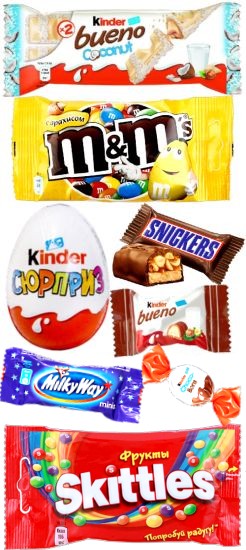 Киндер Сюрприз (1 шт), Киндер Делиз (1 шт), Киндер Буэно (1 шт), Киндер Кантри (со злаками) (1 шт), Киндер Макси (1 шт), Киндер Бонс мини (3 шт), Киндер Шоколад мини (3 шт), Киндер Буэно мини (3 шт)